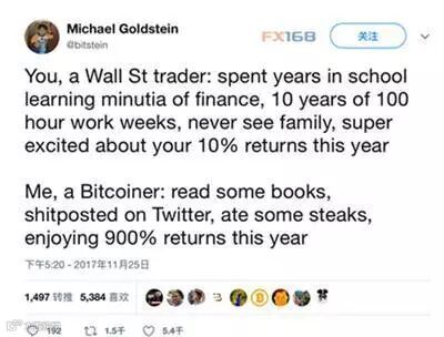 不久前,一位比特币发烧友在推特(21.09, 0.32, 1.54%)上不无炫耀地写道:“你,一名华尔街交易员:数年寒窗苦读金融理论,10年每周工作100小时,连家人都看不到,对今年10%的回报兴奋不已;我:一个比特币玩家:读读书,灌灌水,吃着牛排,今年却得享900%的回报。”