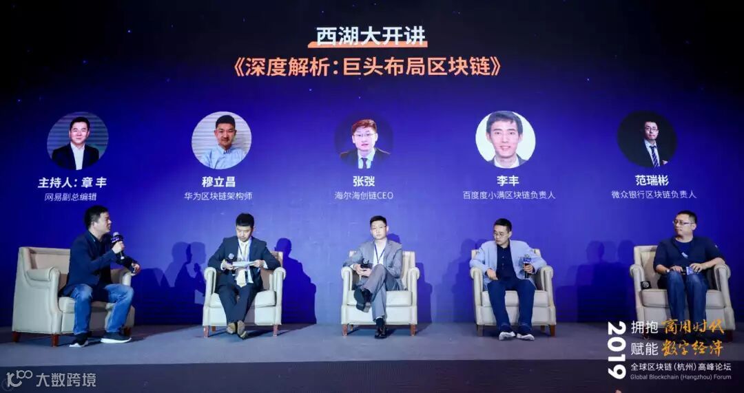 在以《深度解析:巨头布局区块链》为主题的圆桌讨论中,华为区块链架构师穆立昌、海尔海创链CEO张弢、百度度小满区块链负责人李丰、微众银行区块链负责人范瑞彬围绕巨头企业在区块链布局的优势与难点,责任与担当,定位与方向等话题展开了探讨。本场圆桌由网易副总编辑章丰担任主持人。