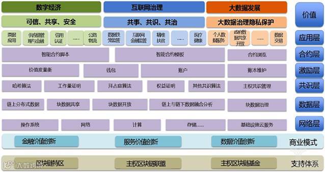 在应用层面,围绕数字经济、互联网治理和大数据发展中的价值实现,区块链规划的应用场景分为政用、民用、商用3类,包括应用层、合约层、激励层、共识层、数据层、网络层6个层次。