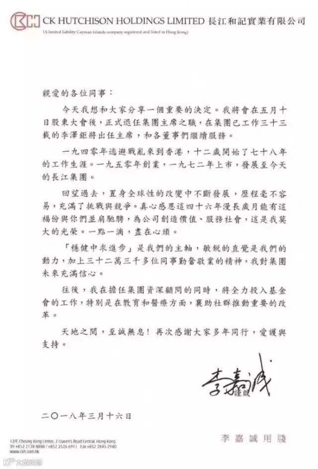 李嘉诚表示“会在主持5月10日股东大会之后正式离任,回忆过去,很感恩创立长江集团,为股东创造价值,服务社会,是他的光荣。感谢大家的厚爱和支持,一点一滴在他心头!”退休后,李嘉诚会做集团顾问,披上新战衣投入“李嘉诚慈善基金会”的工作,尤其是医疗和教育。