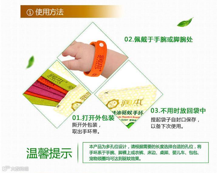 天然草本植物成分,婴幼儿孕妇皆可使用,手环放口袋,枕边,桌边或婴儿推车上皆可以达到驱蚊效果。简单方便,随时随地安心驱蚊!
