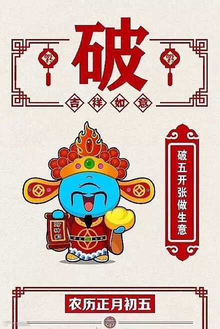 还有一说,初五是财神的生日,所以人们要在这一天大摆宴席,燃放鞭炮,搞多种多样的庆祝活动,寓意就是迎接财神的到来。