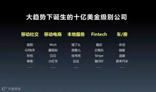 在过去几年的趋势下诞生了很多十亿美元的公司,如果不在这个趋势下,诞生是很难的。比如:移动社交诞生陌陌、快手、秒拍、映客;移动电商诞生了、蘑菇街、贝贝;本地服务诞生了饿了么、微票儿、挂号网、达达;fintech诞生了趣店、分期乐等;车房带动了优信、链家、途家等等。