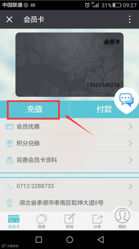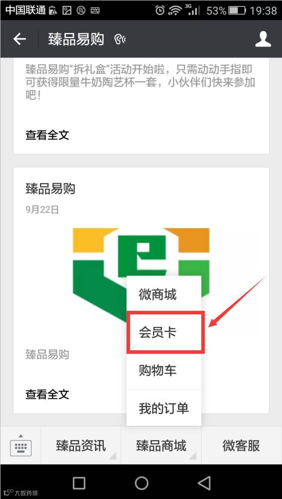 步骤一:打开臻品易购公众号,点击微信商城---会员卡。