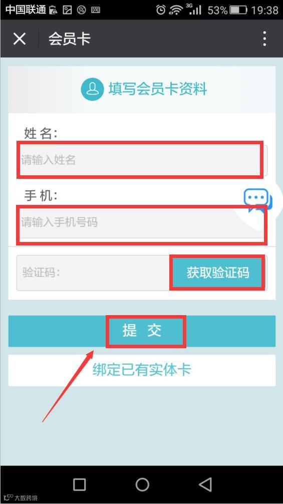 步骤三:输入会员姓名、手机号,获取验证码提交,轻松三部即可完成注册!
