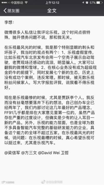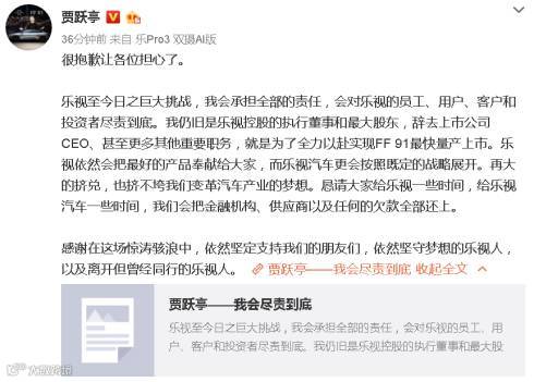 以下为乐视控股执行董事贾跃亭在其个人社交网络平台上发布的声明原文: