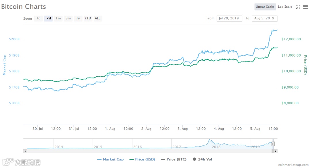 8月5日,根据全球币价网站CoinmarketCap数据,比特币24小时内最低价10673.17美元,最高价11788.92美元,日内最高涨幅超过10%,达10.45%。