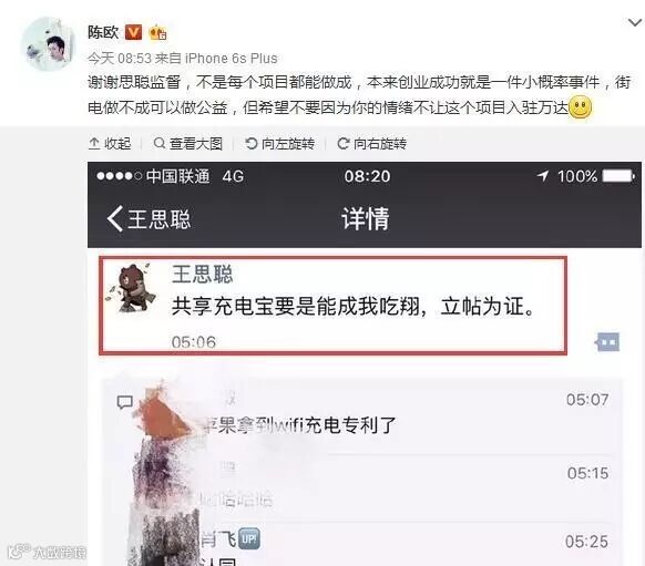 5月4日晚间,聚美优品宣布以3亿元人民币战略投资共享充电宝项目——街电科技,并由陈欧出任其董事长。3亿元的投资额再度创造共享充电宝融资记录,而陈欧亲自上阵也仍然不由得感慨共享充电宝真能啃出那么大块饼吗?对此,王思聪疑似提出质疑,在朋友圈评论:“共享充电宝要是能成我吃翔,立帖为证。”此后,陈欧作出回应,言语中透露出自己对共享充电宝项目的支持。