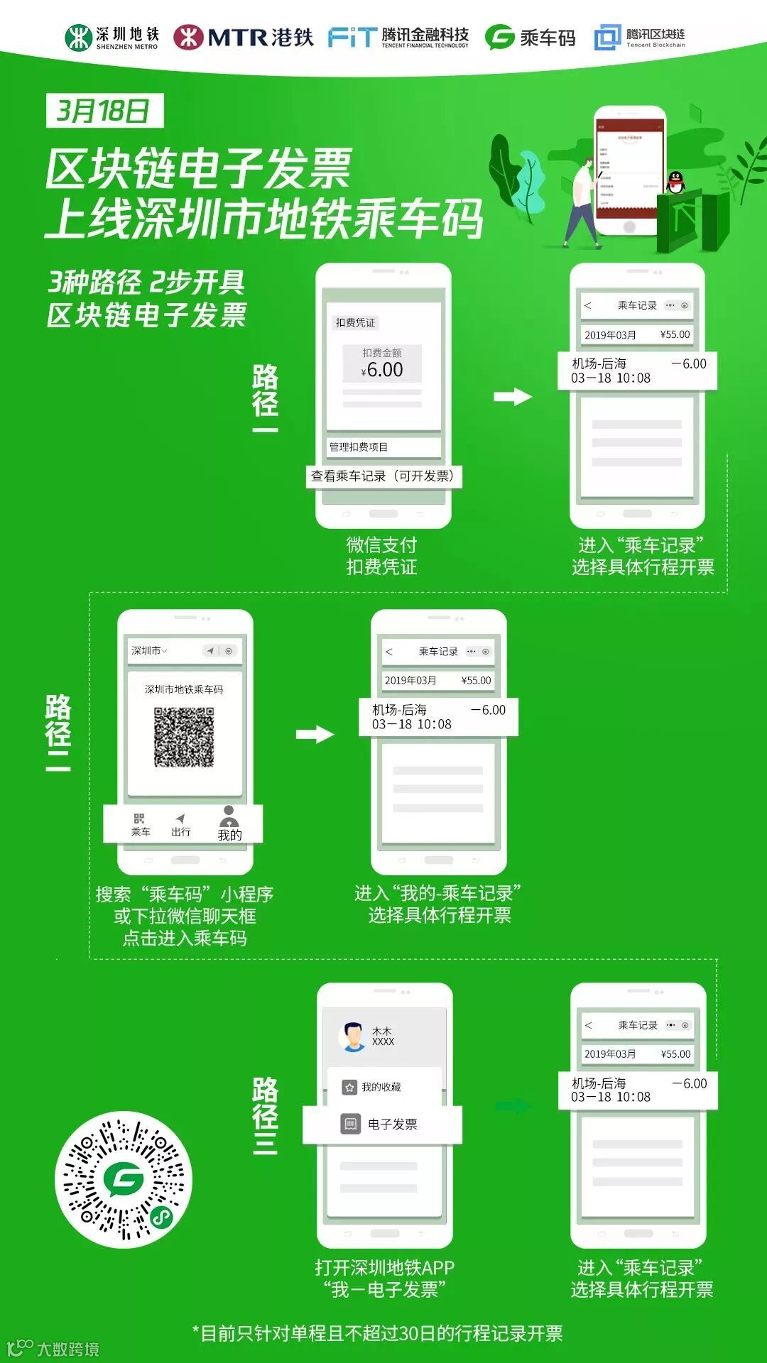 3月18日,全国首张轨道交通区块链电子发票在深圳地铁福田站开出,正式宣告深圳市地铁乘车码上线区块链电子发票功能。即日起,用户使用腾讯旗下智慧交通出行产品乘车码搭乘深圳地铁之后,将可以一键在线开具区块链电子发票。除深圳地铁以外,出租车、机场大巴等交通场景同时上线区块链电子发票功能。
