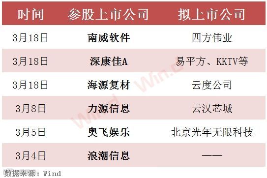 据证券时报,3月18日,南威软件在互动平台表示,公司从参股公司四方伟业处获悉,四方伟业已在四川证监局进行了辅导备案,并正在积极筹备申报科创板,公司也将持续关注四方伟业的相关动态。
