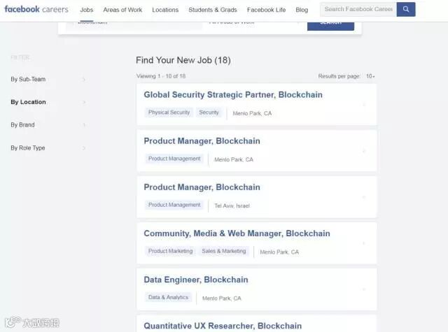 三位知情人士表示,Facebook的区块链项目目前有50多名工程师在做研发,重视程度可见一斑,我相信这并不是空穴来风,2月18日,facebook在其官网更新了招聘简章,其中针对区块链领域就有13个岗位需求。