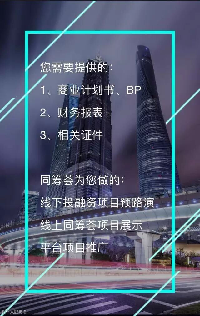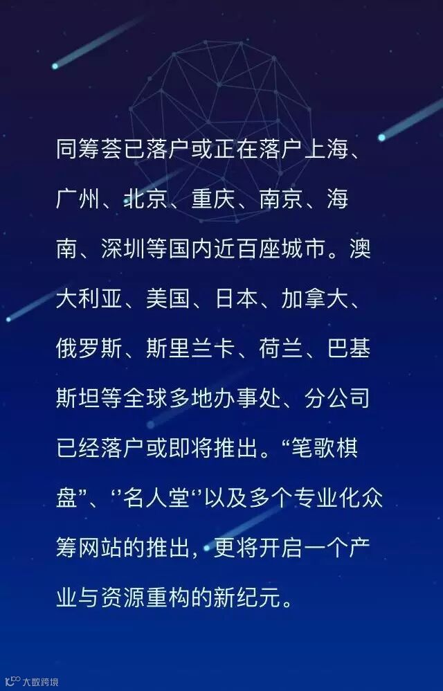 目前“同筹荟”上线项目数百,精准投资人近百万。已落户或正在落户国内近百座城市。全球多地办事处、分公司呼之欲出。“笔歌棋盘”、“名人堂”、“众扶会”、“省钱雷达”以及多个专业化众筹网站的推出,更将开启一个产业与资源重构的新纪元。