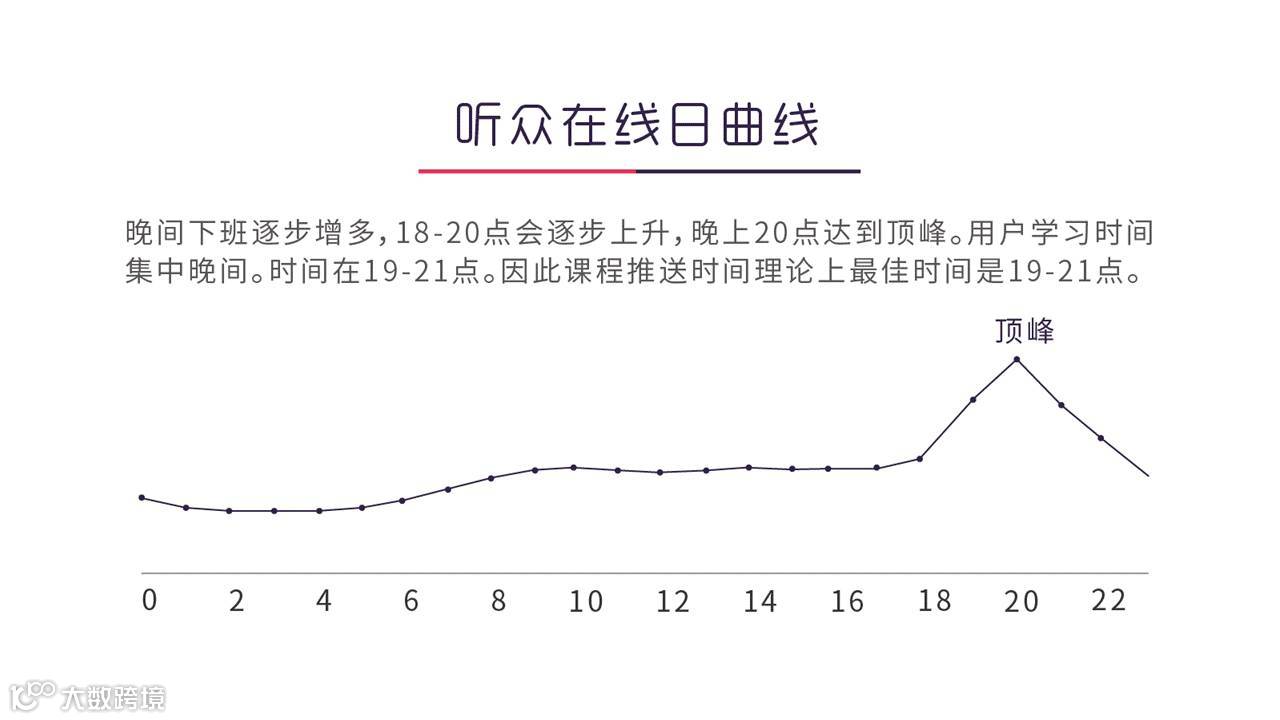 从学员在线周曲线和日曲线结合分析,学习高峰期是工作日的非上班时间,最佳上课时间是周一至周五晚19~21点,也是知识服务者的工作时间。