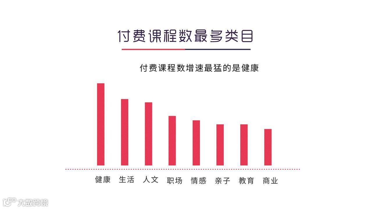 付费课程最多是商业、生活、亲子、职场、教育、健康、情感和人文,其中收入增速最猛的是亲子。