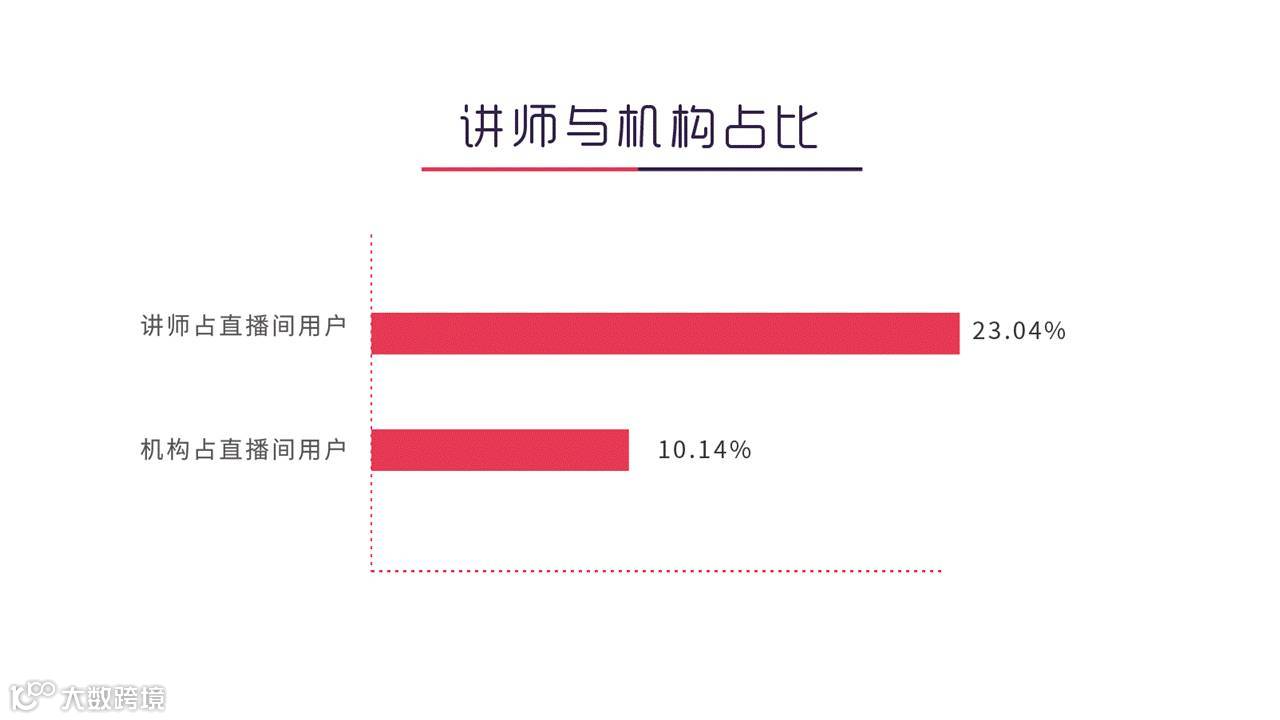讲师和机构的直播间数比约2:1,并且讲师数量增加的趋势明显,全民讲师的时代已经到来,而机构扮演的角色更多是作为行业标杆,树立行业标准。