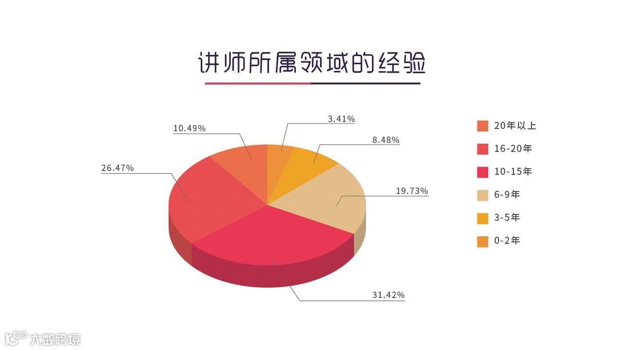 平台讲师3年以上行业经验的占96.59%,其中10~15年经验最多,占31.42%,也就是说行业经验积累到一定程度是可以转化为讲师资本,做内容变现。