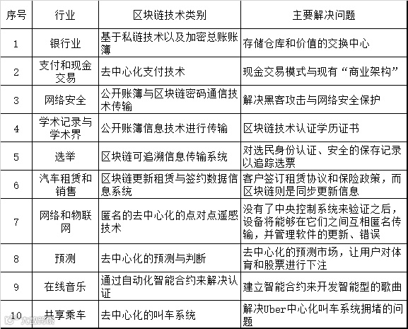 区块链技术用途广泛,除上述场景外,还可用于数字票据、房地产行业等多个场景。目前落地并开始实施的主要包括以下10个主要场景案例,见下表1中所示。