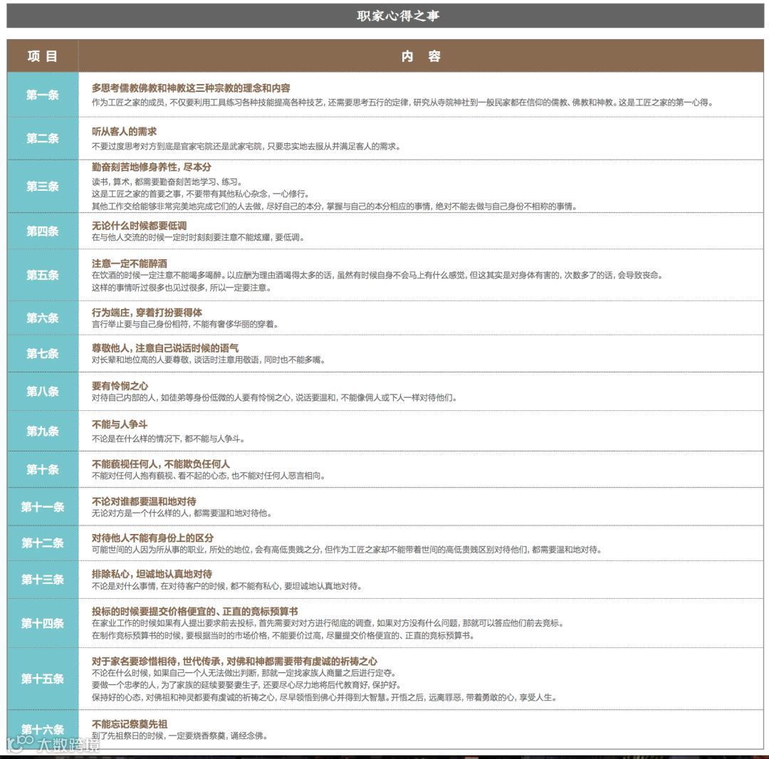 《遗言书》里面的内容非常丰富,包罗万象,既有对金刚组家业经营上的教诲,又有对家族相处之道的叮嘱。关于家族经营方面,在《遗言书》里面有“职家心得之事”16条值得我们关注(见下图)。