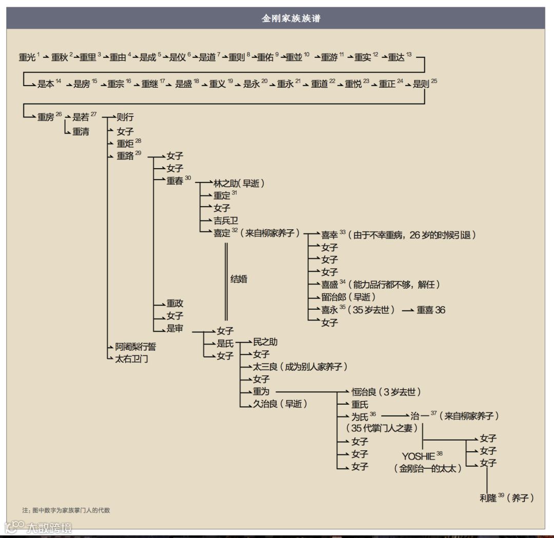 从族谱中可以看出,在金刚家族中有两位第三十六代掌门人,分别是金刚为氏和金刚重喜。实际上这是因为第三十五代金刚喜永35岁就不幸英年早逝,而其儿子金刚重喜还年纪尚幼,于是金刚为氏就暂且作为第三十六代代理掌门人接班,并一直抚养金刚重喜长大成人,在其1898年去世之后,金刚重喜正式就任了第三十六代掌门人。