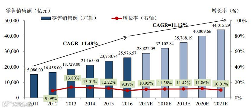 据frost&sullivan数据,2011-2016年,我国家居装饰及家具行业的规模从1.51万亿增长到2.6万亿,年复合增长率为11.48%。预计未来五年的年符合增长率在11.12%。