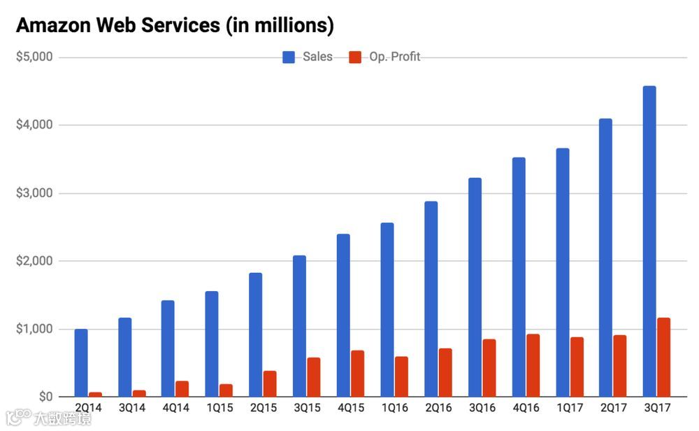 尽管亚马逊的电商业务已经无比强大,但对比之下,AWS的表现更为抢眼。(注:我个人认为,亚马逊应该在监管部门开始执行反垄断措施前尽快剥离AWS业务)