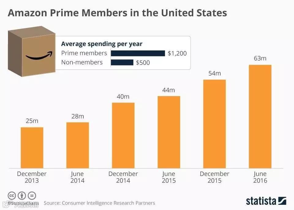 预计全美目前有6300万家庭是Prime会员,约占总人口的35%。Prime服务让亚马逊2017年第一季度的经常性收入增加了19亿美元,让几乎每个家庭的采购量都翻了一番——但这远远不够。对于会员数量,亚马逊的原则只有四个字:多多益善。
