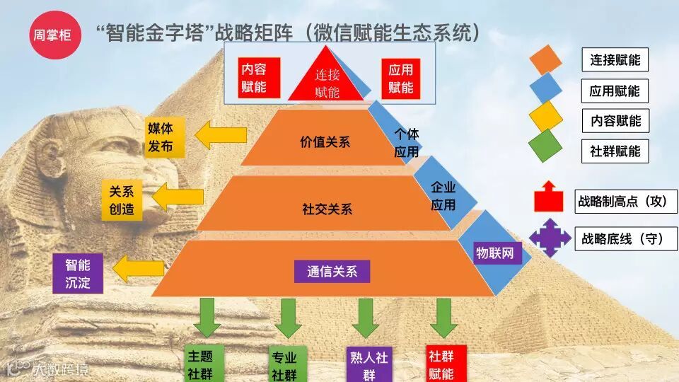 进而分析微信生态,从图5用笔者“智能金字塔”框架勾画的“微信赋能生态系统”图中,我们可以归纳出微信战略在连接、应用、内容和社群四个角度的赋能关系。