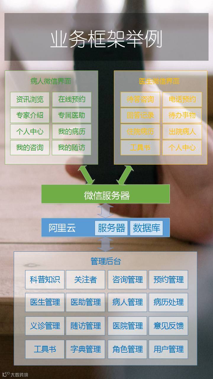 病人和医生和数据信息都是通过微信的服务器将业务运行在这个项目自身的服务器和数据库中。而部署在自己服务器上的应用,是通过管理后台由运营方进行管理和维护。后台的功能就是我们在这张图所看到的了。