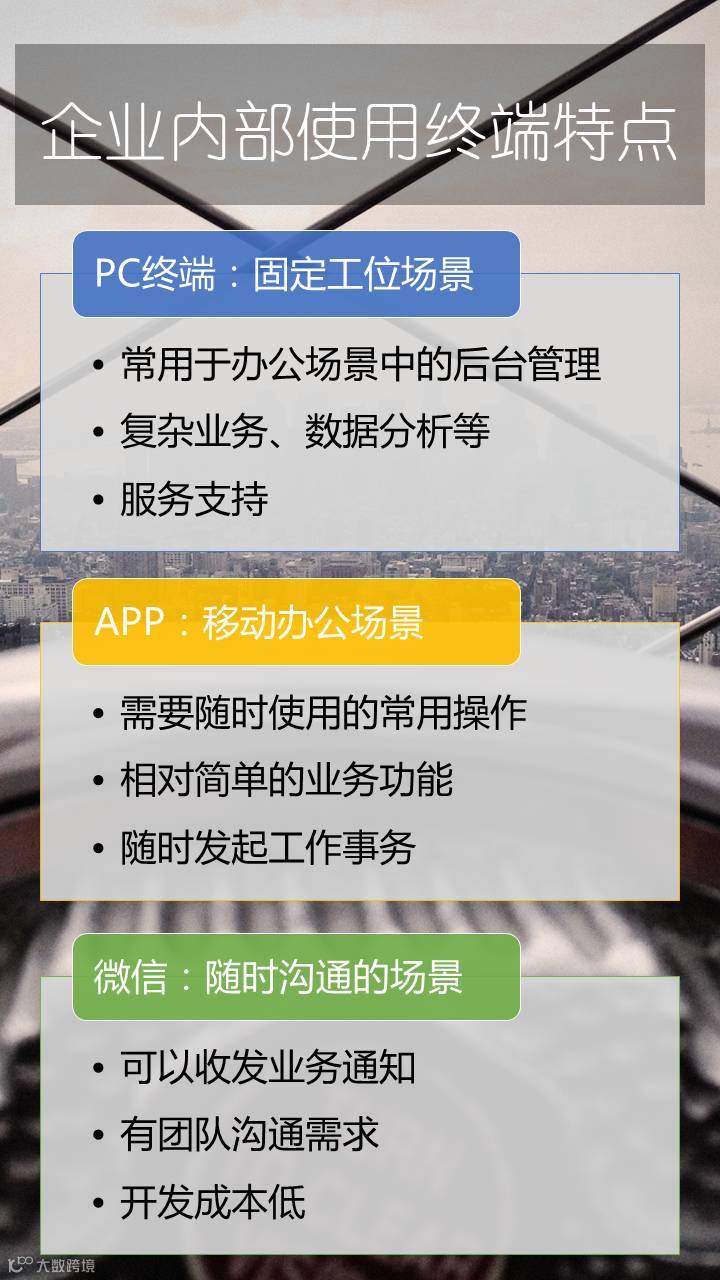 下面我们看一下企业应用中,我们是适合怎样的终端来进行操作,我们做系统的经验是,一定要把合适的功能推送到合适的终端,使用者用起来才会效率倍增。目前企业应用主要的使用区别是固定工位办公和移动办公。