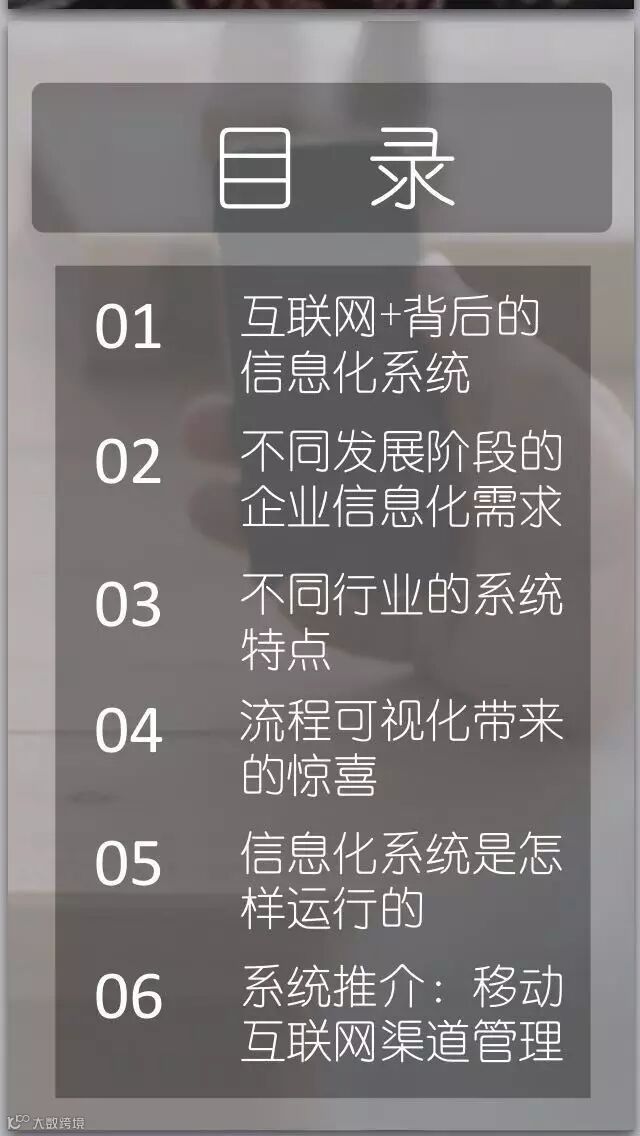 我们今天的这一堂,就是为了让更多的传统企业的朋友对信息系统有些概念上的认识,从而能对我国经济转型升级的新路径有些感觉。我们今天的内容一共有六个部分,分别是:互联网+背后的信息化系统,不同发展阶段的企业信息化需求,不同行业的系统特点,流程可视化带来的惊喜,信息化系统是怎样运行的和系统推介:移动互联网渠道管理。