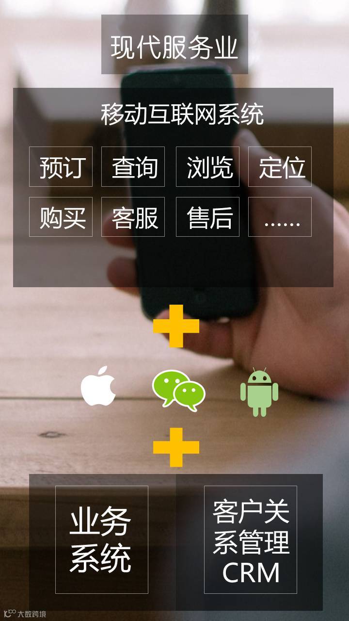 首先,我们来看一下现代服务业。对于服务业,通常我们需要在核心业务系统中给用户提供浏览、查询、预定、购买、客服、售后这些服务,由于客户关系紧密,那么除了最主要的业务系统之外,也需要一套客户关系管理系统,提高核心竞争力,利用相应的信息技术来协调企业与顾客间在销售、营销和服务上的交互,从而提升管理。最终目标是吸引新客户、保留老客户以及将已有客户转为忠实客户,增加市场份额。移动互联时代最终可能需要将微信入口、app全部覆盖才能最大的满足拓展用户的需求。所以通过APP或微信作为入口,使用信息化的技术完成与客户的接触和互动在一段时期内肯定是服务业企业明智的选择。