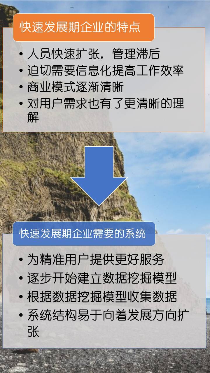 企业快速发展时期,企业规模和人员快速扩张,这时会暴露出管理相对滞后,这个时候是迫切需要信息化提高工作效率的。并且业务的商业模式也逐渐清晰了,对用户的需求也有了更透彻的理解。在这个时候,系统的角色发生了变化,需要为精准用户提供更好服务,可以逐步建立数据挖掘模型,根据数据挖掘模型收集数据,系统结构也会随着业务发展快速扩张。