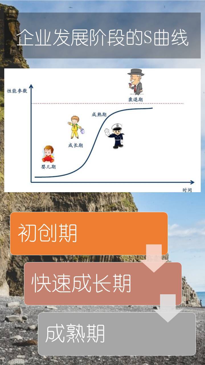讲完各个终端的使用特点,我们现在看一下企业发展在不同阶段适用什么样的系统。这张图是企业发展阶段的曲线图,大部分的企业都是这样的S曲线发展的,会包含初创期、快速成长期和成熟期,不同的时期对系统的需求也往往是不同的,下面我们分别来说说不同时期来和大家介绍一下。