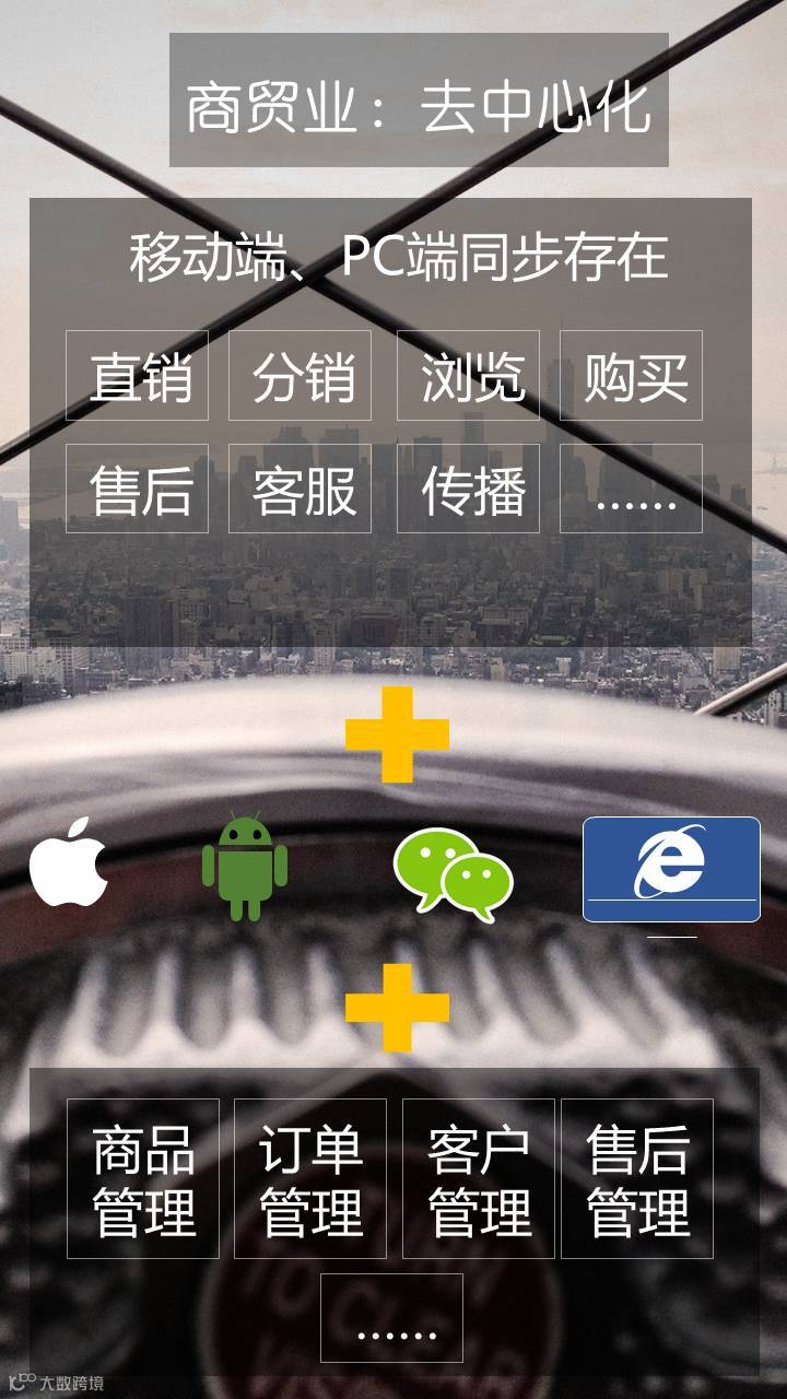 最显著的一个特点就是去中心化,以前用户购物全部都会直接去几个大的电商平台,像天猫、淘宝、京东,是人与店或人与平台的关系,现在随着垂直电商、移动电商、微商的发展,直销、分销模式的普及,去中心化的趋势越来越明显,以前人、店、平台的关系逐步演化成为了人与人的关系。在这样的环境里商贸企业自建移动电商和分销渠道就成为了一个重要的发展方向。