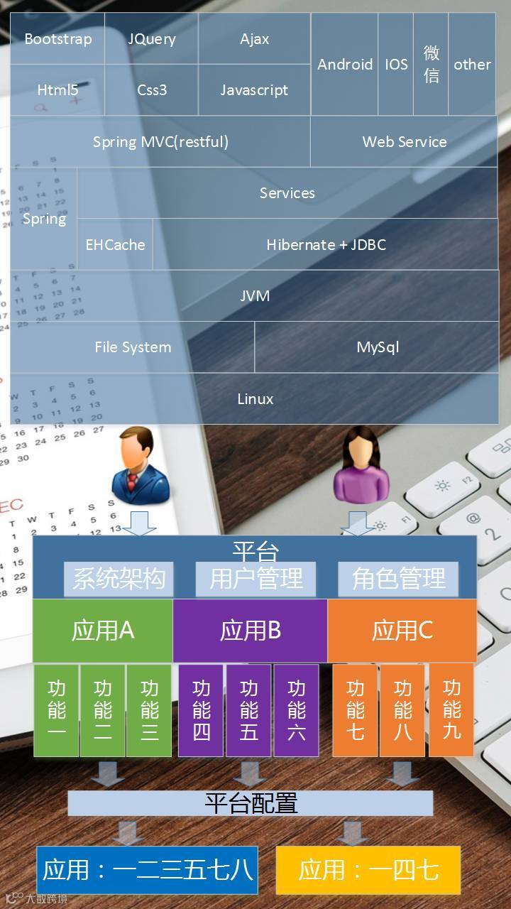 从业务的方面来, 一个系统往往是由许多子应用和功能模块组成的,一个好的系统设计可以在使用中根据实际需要不断添加新的应用和功能,因为需求是渐进明晰的。我们在使用系统的时候不同的功能通常是由角色定义和功能分配来做的。我们看下面这张图,每个用户进入平台系统首先来识别这个用户所拥有的角色,然后再根据这个角色的在各个应用中所可以进行的功能,通过平台配置的方式来完成每个用户在整个系统中可使用的功能。