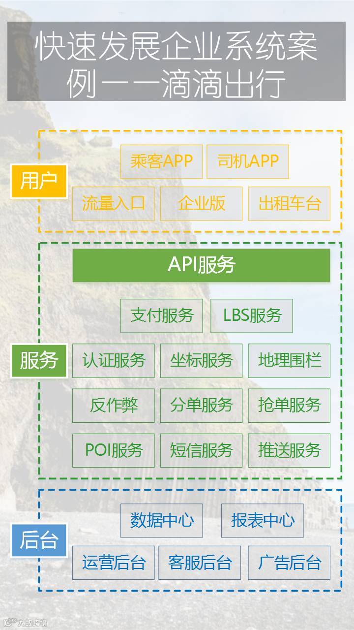 这张图是滴滴出行的案例,我们可以看到整个系统分为了三个部分,用户端、系统服务、后台管理端。用户端非常精准的按不同的用户类型,分别开发了乘客APP、司机APP、流量入口、企业版、出租车台 。这样更好的满足了每一类用户的具体需求。乘客APP和司机APP我们大家都很熟悉了,流量入口就是指我们平时在微信或者其他APP中看到的滴滴出行的广告,点击进去之后可以抢红包,可以下载APP等等,是一种拉新和激励的方式;
