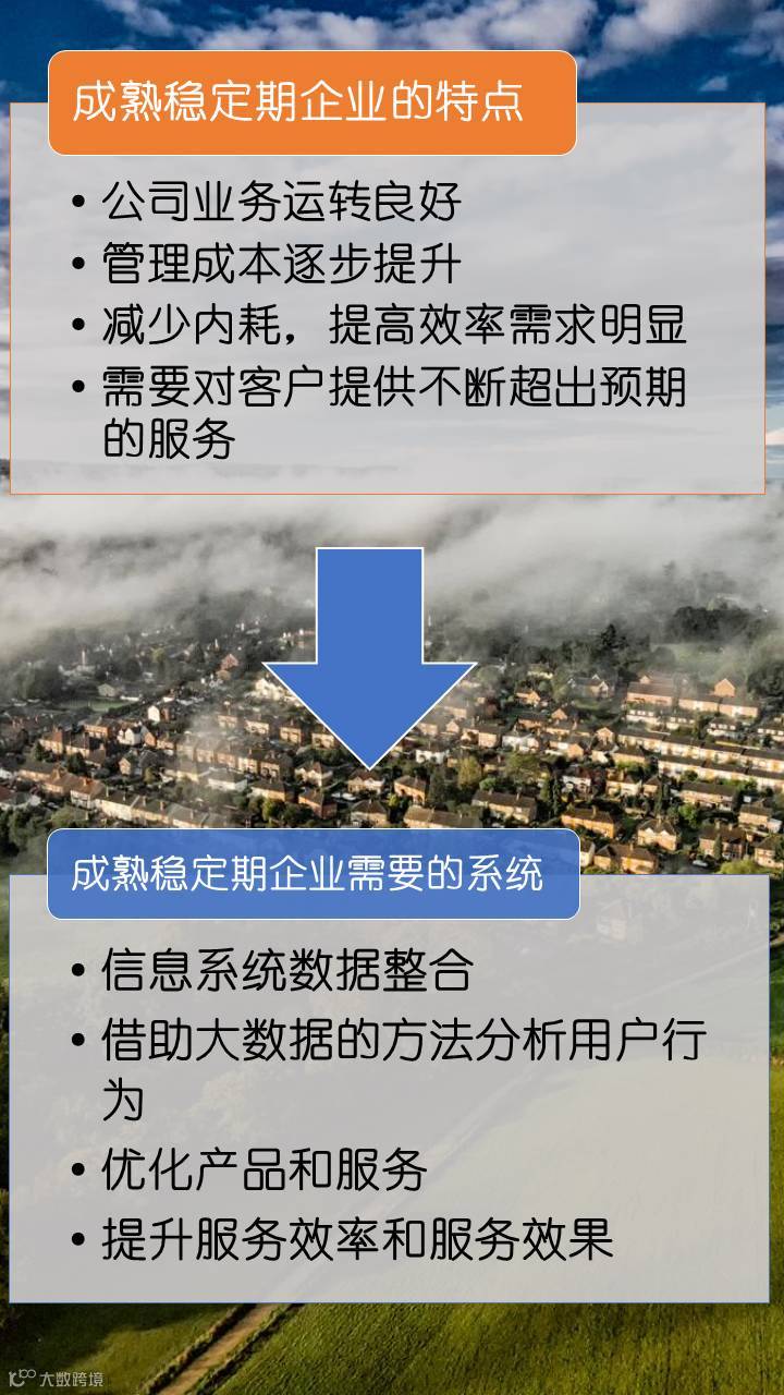下面我们再看看进入成熟稳定期的企业有什么特点,对系统有什么要求。一个进入成熟稳定期的企业,通常公司业务发展平稳,管理成本已经很高,内耗会比较严重,客户期待服务质量要不断提升。这时候企业会迫切的需要对既有的信息系统进行系统整合,实现数据打通,并且可以借助大数据的分析方法分析传统业务和用户行为,借以优化产品、提升服务,下面我介绍一个成熟企业的案例。