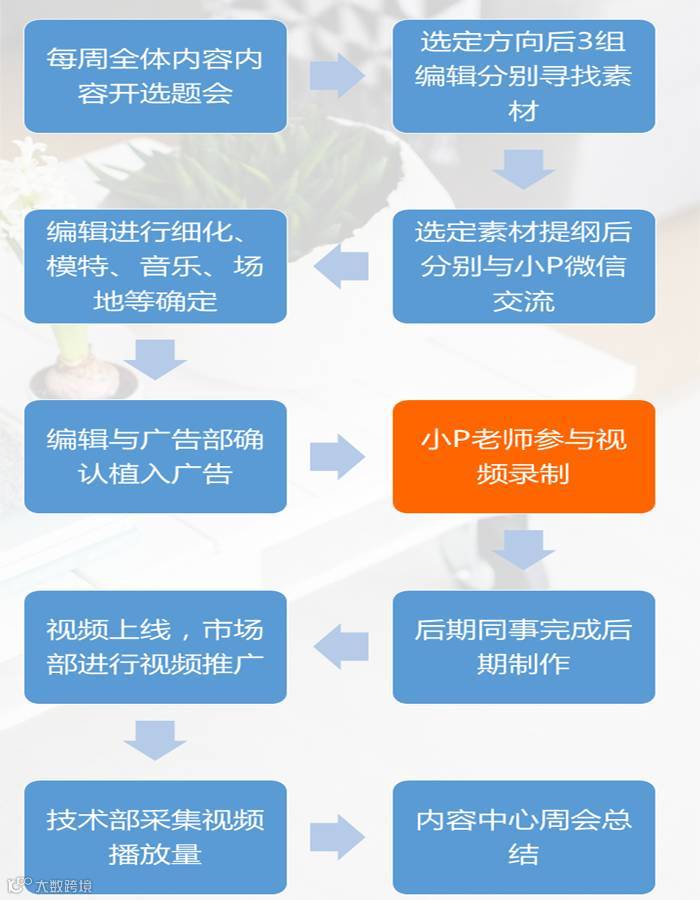 内容中心的同事开选题会,每个选题要提前 2-4周进行内容准备,每周至少选定三组方向,每组方向 2-3期的内容,由负责的编辑开始寻找素材。编辑初选出的素材提纲会由编辑与小 P老师在微信上交流。确定的提纲由编辑进行细化、确定模特、音乐、场地等等元素。编辑再与广告部的同事确定植入的广告。最关键的环境就是小 P老师参与视频录制。录制完成后,后期同事完成后期制作,然后开始视频上线,市场部的同事开始进行视频推广,小 P老师的视频在爱奇艺、微博、腾讯视频都是有专区的。视频播放推广开始,由技术部门完成视频播放量的采集工作,两周以后视频的播放量会在内容中心的例会上进行讨论,分析这个视频播放量高或者低的原因,比如话题的时效性、热门性,相关广告商的宣传。
