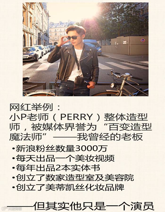 给大家举个网红的例子,我曾经的老板小 P老师,被媒体界誉为百变造型魔法师。他新浪粉丝数量 3000万,每天出品一个美妆视频,每年出品 2本实体书,创立了数家造型室及美容院,创立了美蒂凯丝化妆品牌。大家可能觉得小P老师太能干了,有那么多美容心得,把那么多明星变漂亮了,但他其实只是一个演员,网红传递出的内容是有团队来帮他完成的。