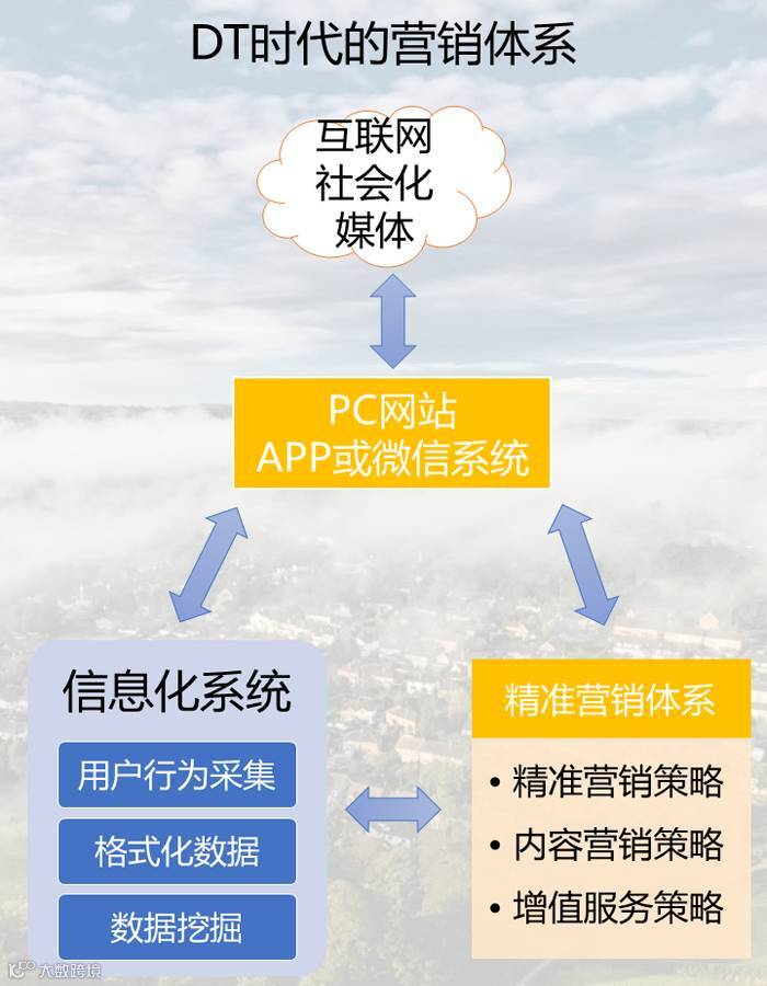 最后,我们总结一下 DT时代的营销体系。既然是 DT时代的营销了,肯定是使用数据贯穿整个过程了。用户在 PC网站、APP或者微信系统中进行操作和活动,请大家注意一下,我这里提到的是微信系统而不是微信,也就是说是通过微信作为入口进入的第三方开发的系统。关于微信里的系统我们会在下一节课中进行讲解。所有用户的行为通过信息化系统将用户行为进行采集,采集后进行格式化数据处理和数据挖掘。同时在我们的精准营销体系中,完成精准营销的规划,精准营销的规划包含精准营销策略、内容营销的策略以及增值服务的策略,根据这些策略完成对数据挖掘产生的用户数据进行人群细分、内容推送、个性化服务的推荐、信用等级体系的搭建等等,并通过网站、APP或者微信系统推送给每个用户,再由用户把内容或口碑评价传播到社会化媒体上。这就完成了 DT时代的整个营销体系的闭环。