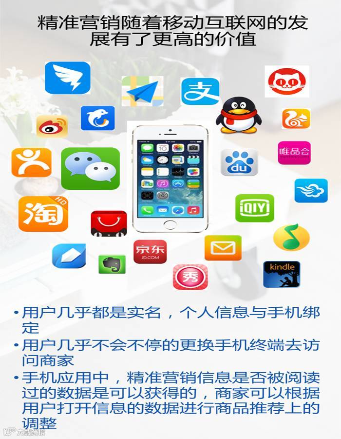 精准营销的概念已经提出了很多年了,但是随着移动互联网的发展,精准营销有了个更高的价值,那是因为:用户几乎都是实名,个人信息与手机绑定,用户几乎不会不停的更换手机终端去访问商家,手机应用中,精准营销信息是否被阅读过的数据是可以获得的,商家可以根据用户打开信息的数据进行商品推荐上的调整。