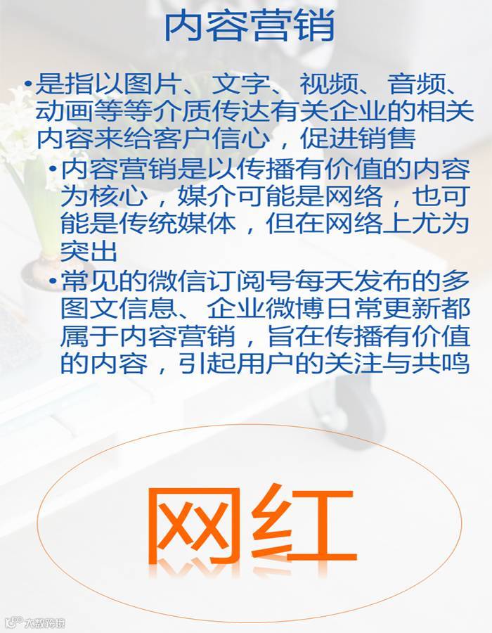 内容营销本来没有那么引人注意,终于有一天,出现了一个和互联网相关的角色,网红。首先我们来看一下,内容营销是什么。内容营销是指以图片、文字、视频、音频、动画等等介质传达有关企业的相关内容来给客户信心,促进销售。内容营销是以传播有价值的内容为核心,媒介可能是网络,也可能是传统媒体,但在网络上尤为突。常见的微信订阅号每天发布的多图文信息、企业微博日常更新都属于内容营销,旨在传播有价值的内容,引起用户的关注与共鸣。