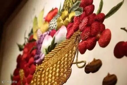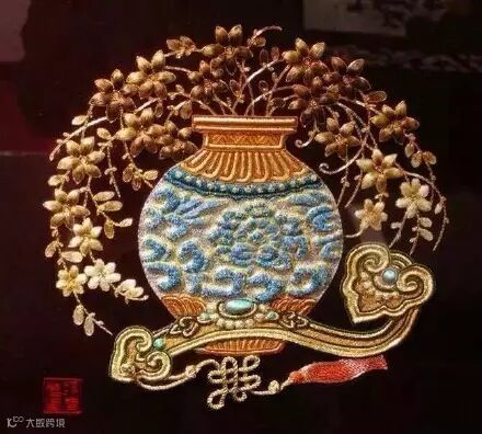 潮绣,中国四大名绣之一,与广绣合称为粤绣,是潮汕地区的主要传统工艺美术品。潮绣有绒绣、钉金绣、金绒混合绣、线绣等品种,各具特色。题材有人物、龙凤、博古、动物、花卉等,以饱满、匀称的构图和热烈喜庆的色彩,气氛鲜明、生动地表现题材,使潮绣产生了丰富瑰丽的艺术效果。