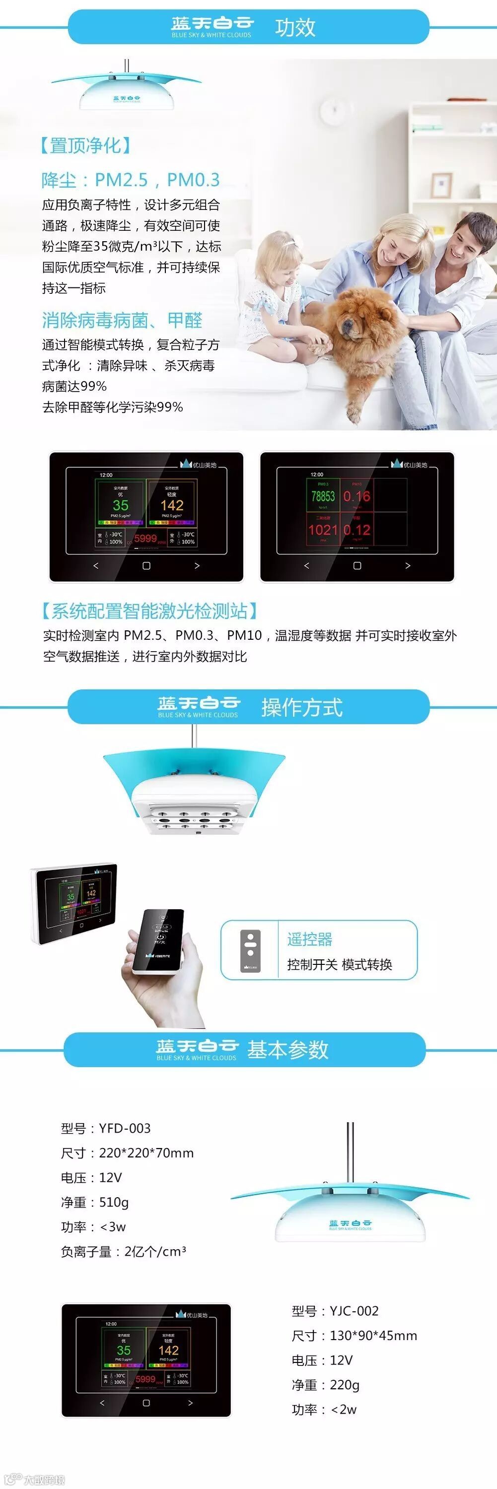 优山美地十余年致力于负离子与空气净化相关技术的研究,开发出一批精准定向的优秀产品。因为居室的空气环境健康与否对人体的身心健康,孩子的智力发育,老人的健康养生会产生巨大的影响,为此我们定向研发了一套居室智能空气管理系统——“蓝天白云”智能空气净化系统,包括PM2.5粉尘净化,杀灭病毒病菌,释放负氧离子新鲜空气及二氧化碳的排出,并参照国际优质空气标准验收。