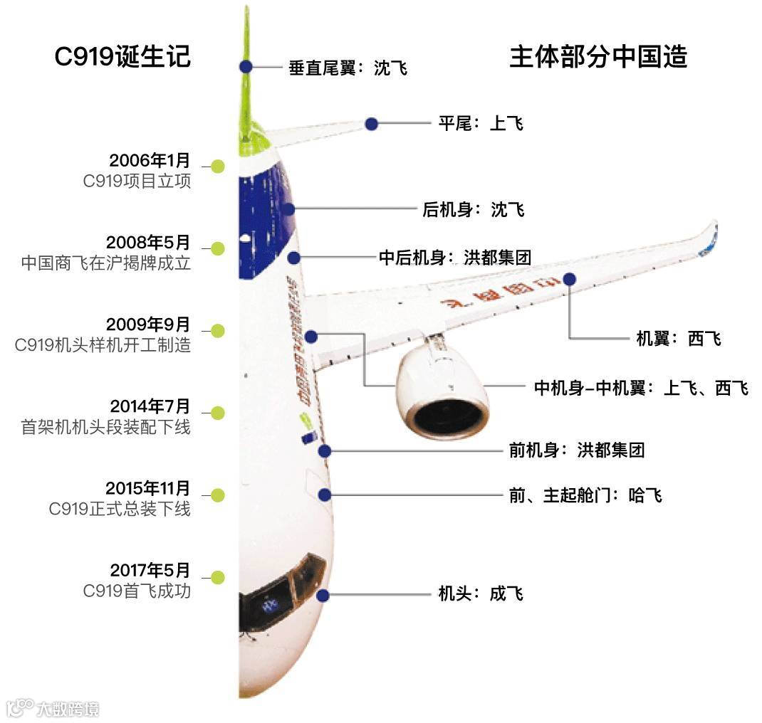 C919采用国际通行的主制造商+供应商模式,主制造商就是中国商飞公司,负责设计研发、总装制造。飞机结构中,中机身中央翼是商飞制造的,机头来自成飞,前机身、中后机身来自洪都,机翼来自西飞,垂尾来自沈飞……国内22个省市、36所高校、200多家机构参与研制,16家国际一流供应商为其服务。