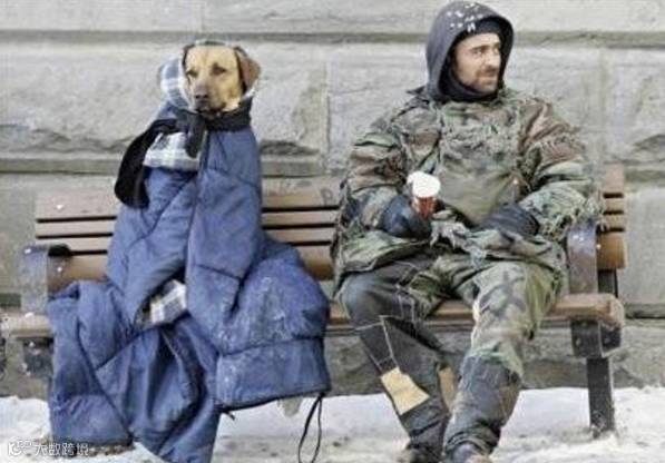加拿大流浪汉,摄氏零下15度,用满是补丁的衣服把自己包得紧紧的,然后把他唯一的财产、或许也是最重要的财产睡袋给了他的狗狗。------- 你若不离,我定不弃.