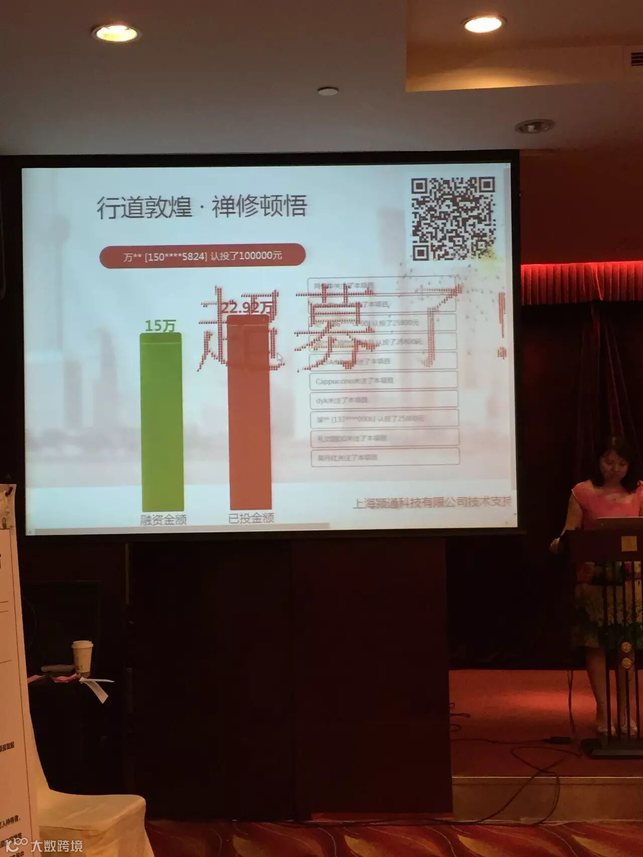 同筹荟本次路演使用的认投方式是全新互联网金融O2O技术:路演现场认投及展示系统。路演现场各位投资人扫码即可进入手机认投界面。输入认投金额且微信支付定金,认投效果即刻在大屏幕上显示。