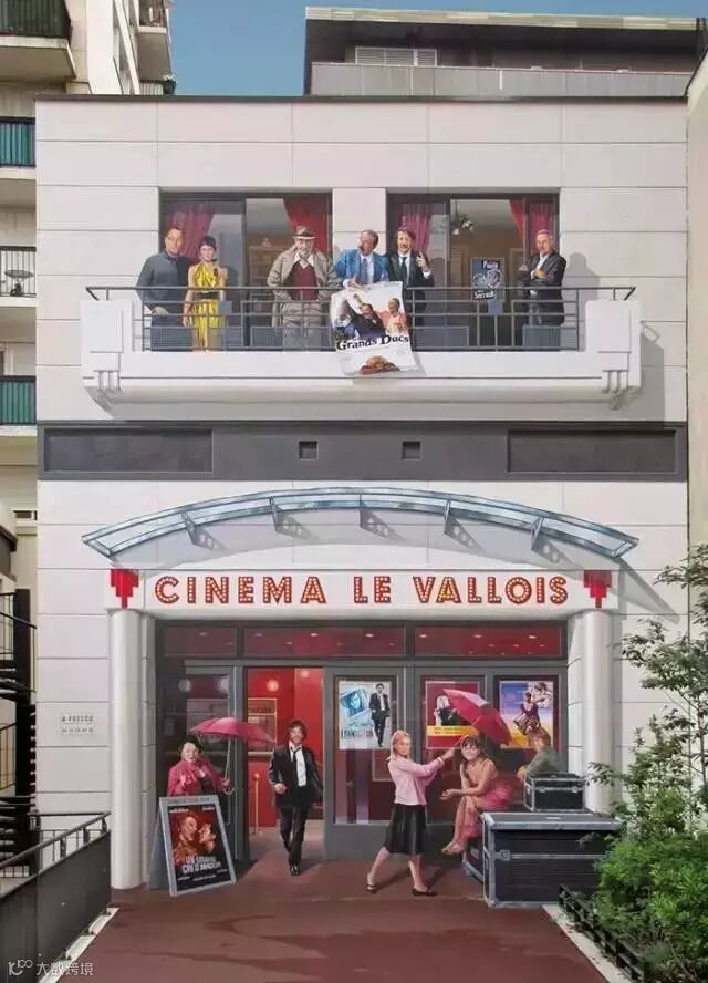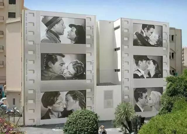 荧幕上经典的接吻镜头也被搬到墙上