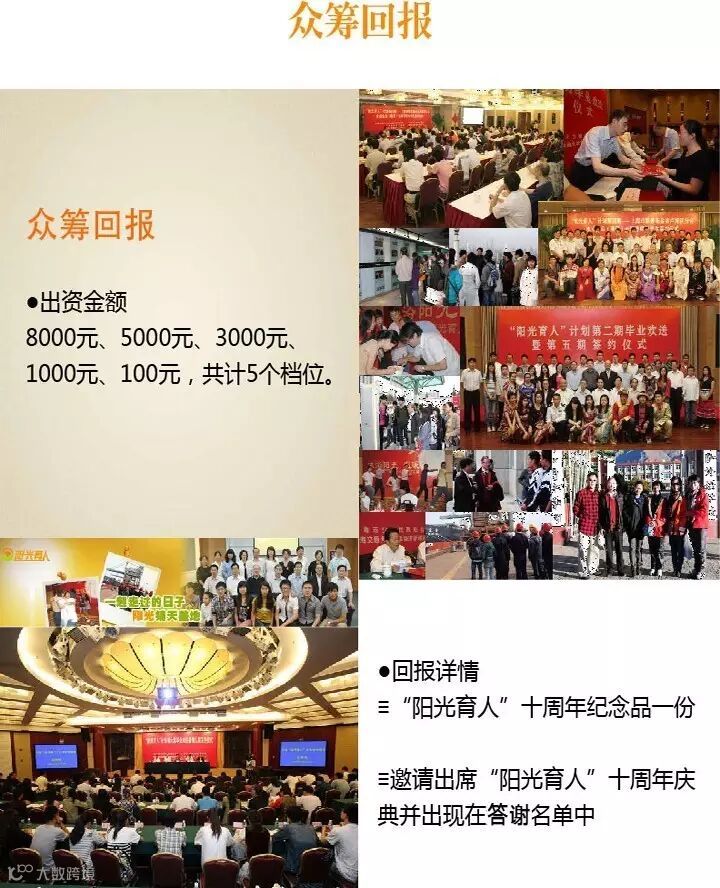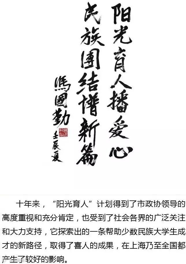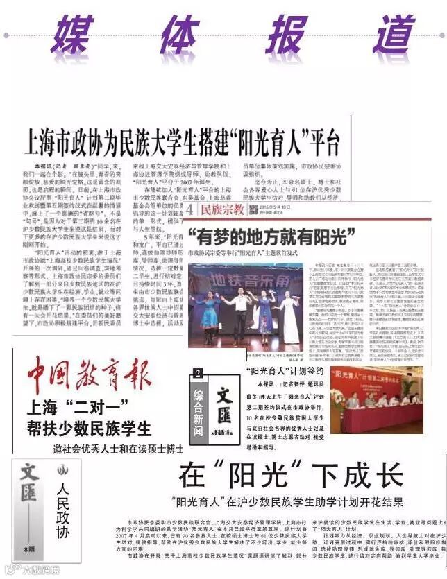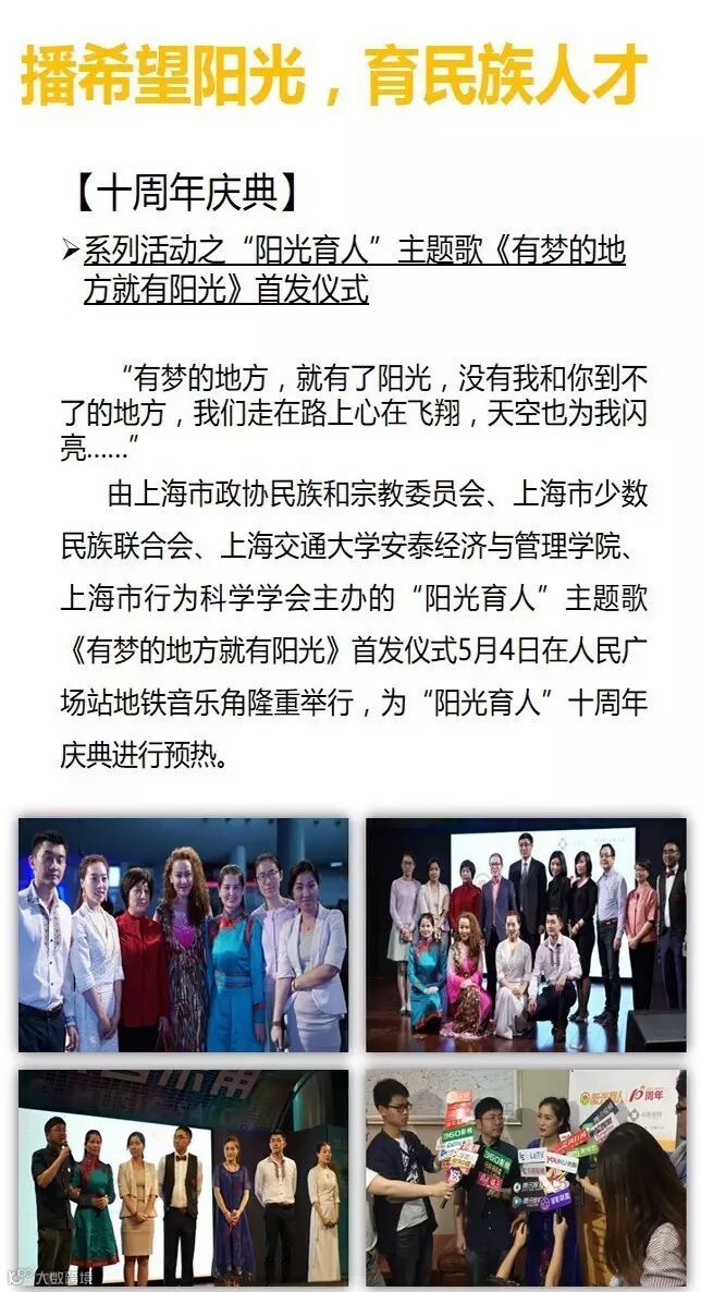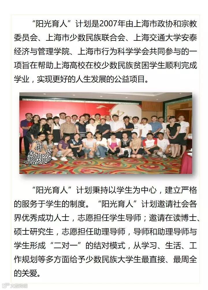 “阳光育人”计划一直秉持以学生为中心,建立严格的服务与学生的制度。是一项旨在帮助在沪高校少数民族优秀困难大学生的公益性活动。受助学生既可获经济资助,还可与优秀企业经营者、专家学者建立经常联系。计划实施三以来,学生和社会参与面不断扩大.如今恰逢阳光育人十周年,特发起众筹,共助莘莘学子的梦想起航。