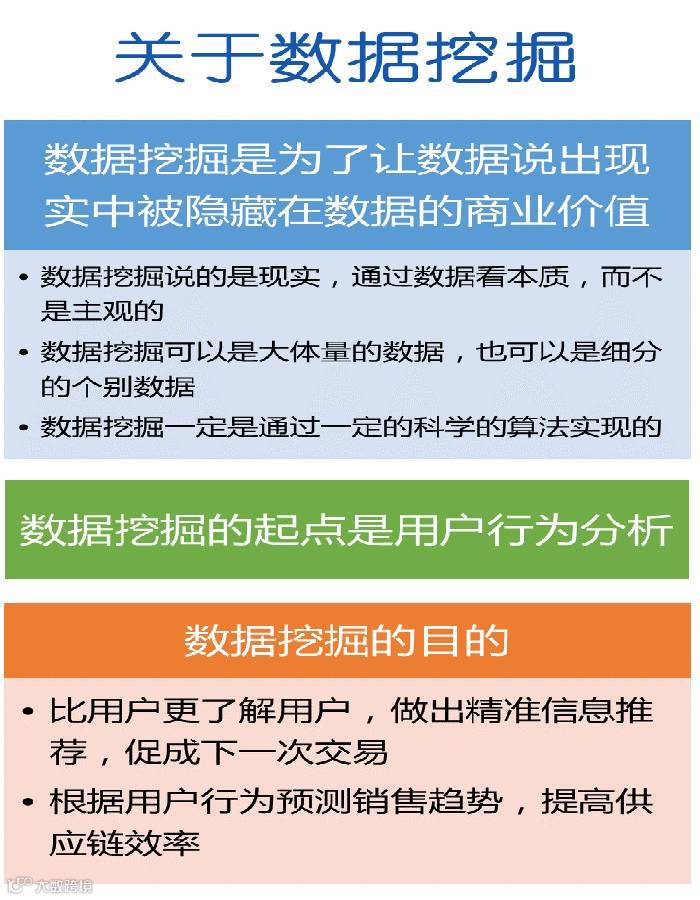 很多人都觉得数据挖掘很枯燥,很难懂,我们现在来了解一下数据挖掘到底是个什么鬼。首先数据挖掘就是为了让数据说出现实中被隐藏在数据背后的商业价值。我们是为了让数据说出事实,说出本质,而不是人的主观判断。数据挖掘可以是通过大量的数据,也可以是细分领域的个别数据,大家注意一下,我这里说的是数据挖掘,而不是大数据。另外就是数据挖掘一定是通过一定的科学的算法实现的。如果某些数据挖掘出来的结果是匪夷所思的,那么就有可能是数学模型建的误差太大。数据挖掘在互联网上应用的起点就是用户行为分析。而数据挖掘在电商领域中应用的目的主要有 2个方面,一个是做到更了解这些未曾蒙面的用户,做出精准信息的推送,促成下一次交易,另一个是根据用户行为预测销售的趋势,提高供应链的效率。比如根据京东的数据挖掘,网站用户浏览量最多的电子产品的商品,7天后才会出现该产品的购买高峰,也就是说平均用户需要用 7天来考虑购买该产品这件事,那么京东就根据这个数据来进行备货,提高资金周转率。